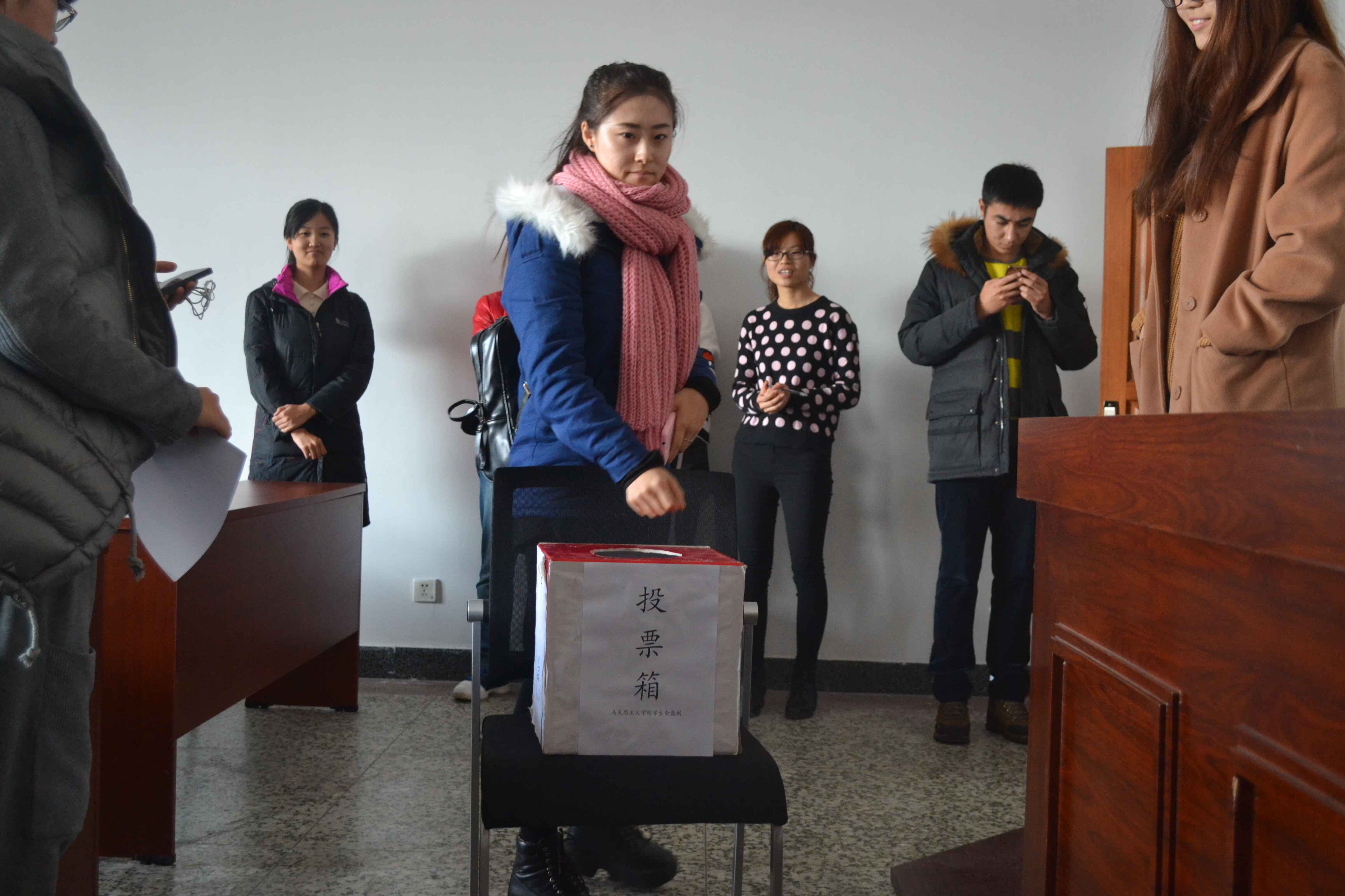 12时40分,王天一对四位候选人作简短介绍后,选举正式开始。选举流程为由计票人清点学生人数,报给总监票人;监票人检验加封票箱公示给同学;计票人领取选票分发给每位同学;组织各位同学依次进行投票。投票结束后,监票人、计票人当场开箱清点选票,并由计票人统计选票,最后,王俊涛宣布今年会jinnianhuicom新一届学生代表为2013级本科生杨春梅和2014级本科生宋志鑫。