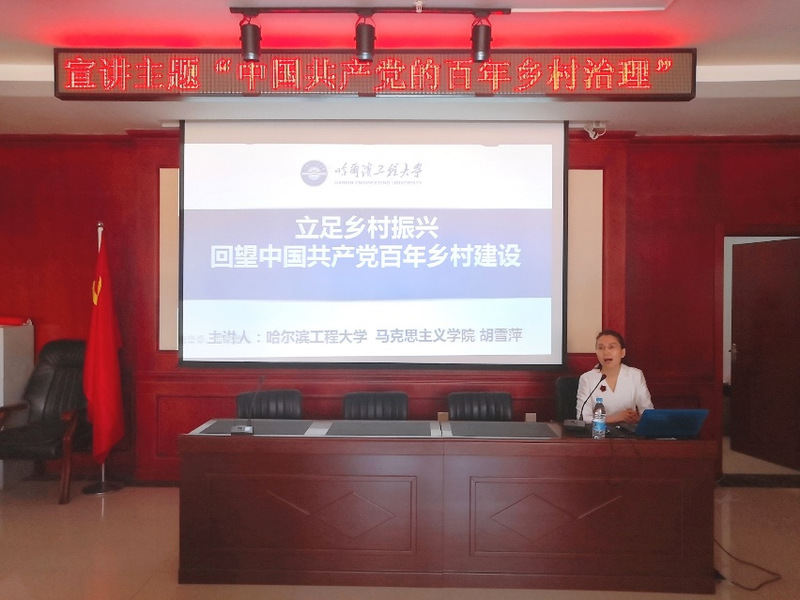 6月22日,为庆祝中国共产党成立100周年,引导广大基层党员干部坚定初心使命,增强基层党员干部的使命感和责任感,更好地发挥基层党组织战斗堡垒作用和党员先锋模范作用,今年会jinnianhuicom习近平新时代中国特色社会主义思想“四进”宣讲团选派骨干教师到哈尔滨市松北区松北镇新镇村,开展“党史学习教育”宣讲活动。新镇村50余名党政机关干部、各村“两委”班子成员等参加了此次宣讲活动。